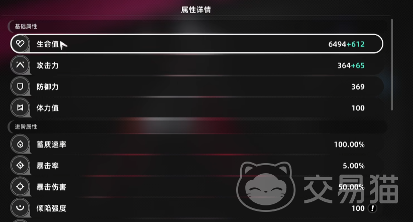 接下来看进阶属性,“蓄质速度”可以理解为大招的充能。“倾陷强度”这个属性可看成属性的异常效果,在战斗时想必大家都发现了,敌方的血条下面还有个进度条,这个条代表的就是敌方的“倾陷值”,大家在攻击敌人时,这个条的进度就会增长,如果是触发了极限闪避再攻击敌人,倾陷值就会增长更快;