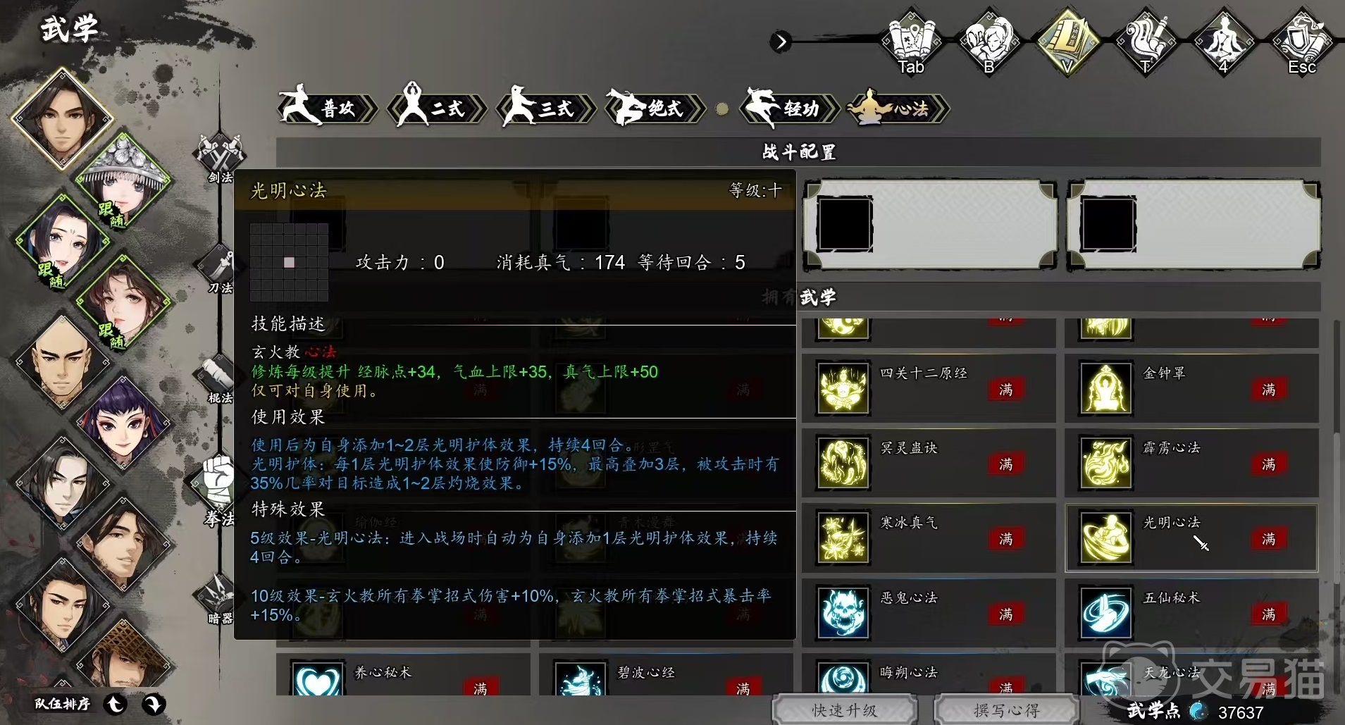 升到10级之后的效果是,玄火教所有的拳掌招式增加10%的伤害,玄火教所有的拳掌招式,暴击增加15%,所以这就是一项配合着玄火教的招式来发挥作用的心法。如果大家不走玄火教的功法路数,这个心法的效果并不突出。因为有了这样的效果,所以搭配起来的套路就比较单一,内功方面可以和玄阳离火功搭配。之所以选择这项内功,是因为玄阳离火功带来的防御提升效果非常明显,还有大范围的群伤以及回血并且减少心法cd,被灼烧效果的敌人攻击还可以回蓝加集气值,所以是光明心法的好搭档,配合起来可以显著增强生存和输出能力。也可以搭配上五恒天经,五恒天经能锁住高面板属性,和光明心法一起搭配使用,在提升防御的同时,也能比较好的维持度输出面板。