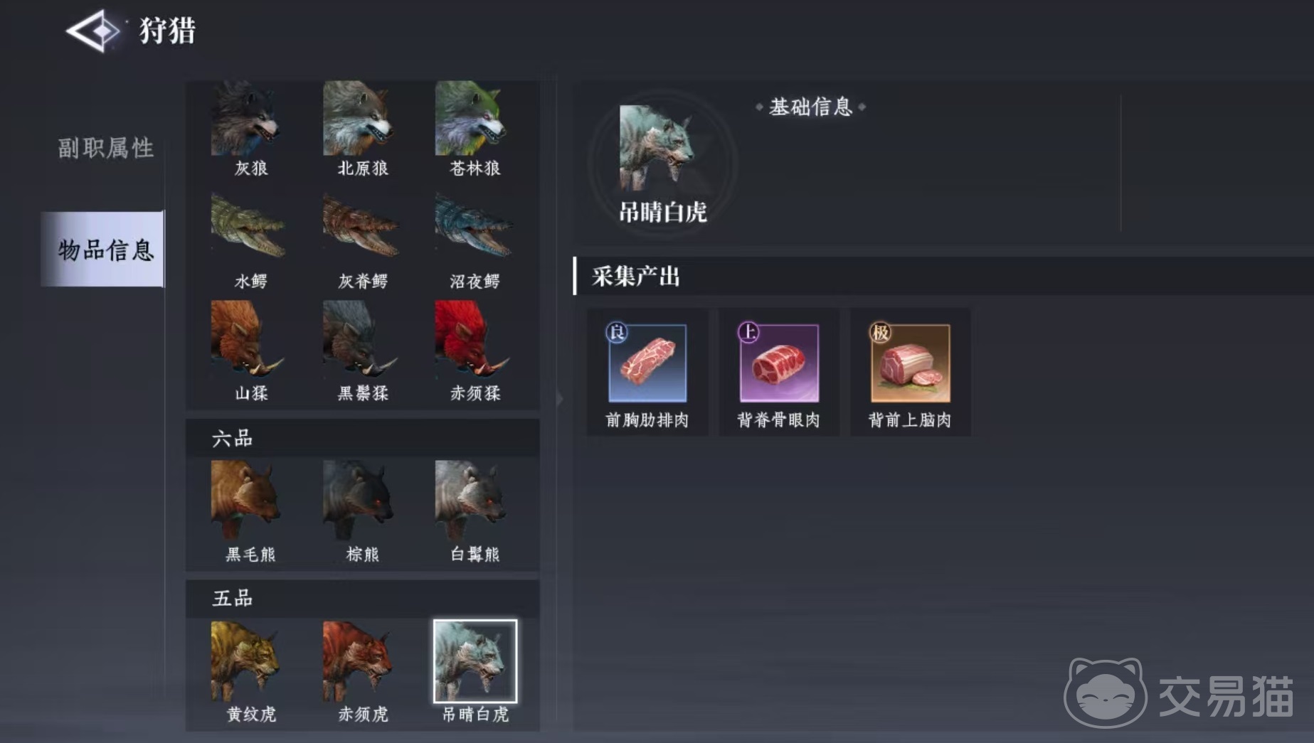 狩猎所获取到的收益也是从九品开始,一直到最高的五品。其中九品主要产出的是臀围米龙肉,八品产出的是里脊嫩尖肉,七品产出的是前胸肋排肉,六品产出背脊骨眼肉,五品产出背前上脑肉等。需要大家找到对应的猎场,才可以获得高品级的收益。而且每一次狩猎也不是完全能够产出高品,也有一定的几率产出低品质,所以也是比较看脸的一项操作。