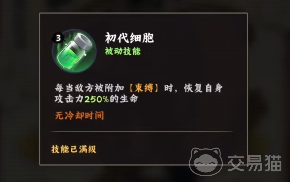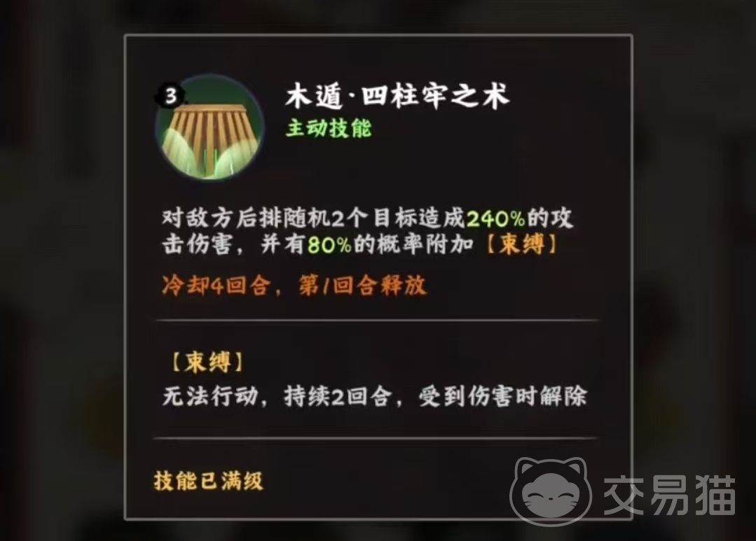 看一下大和的基本技能效果,主动技能木遁四柱牢之术,对敌方后排随机两个目标造成240%攻击力的伤害,并有80%几率附加束缚效果。对方被束缚之后,持续两回合无法行动,受到伤害后会解除。这样既有伤害又有控制,只是随机目标对于战术而言又多了一些变数,不过后排目标不会太多,所以随机两个基本上都能控制到。而且对方的核心输出往往是放在后排,所以这个技能的控制效果比数值看上去要更高效。