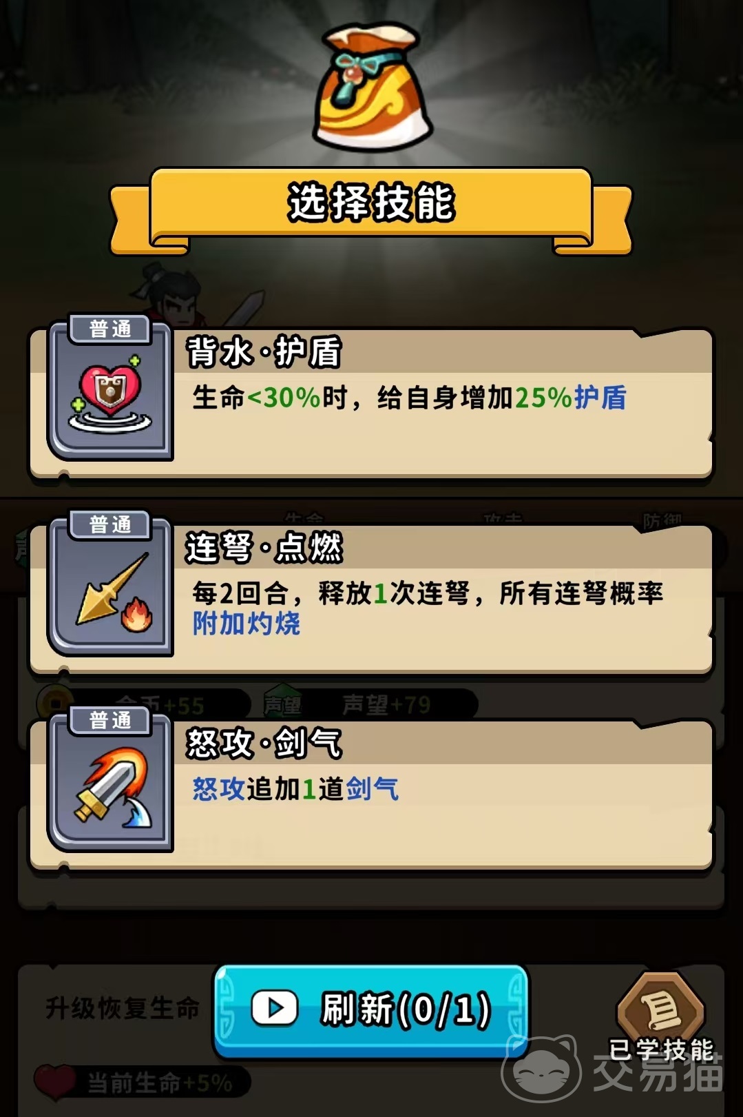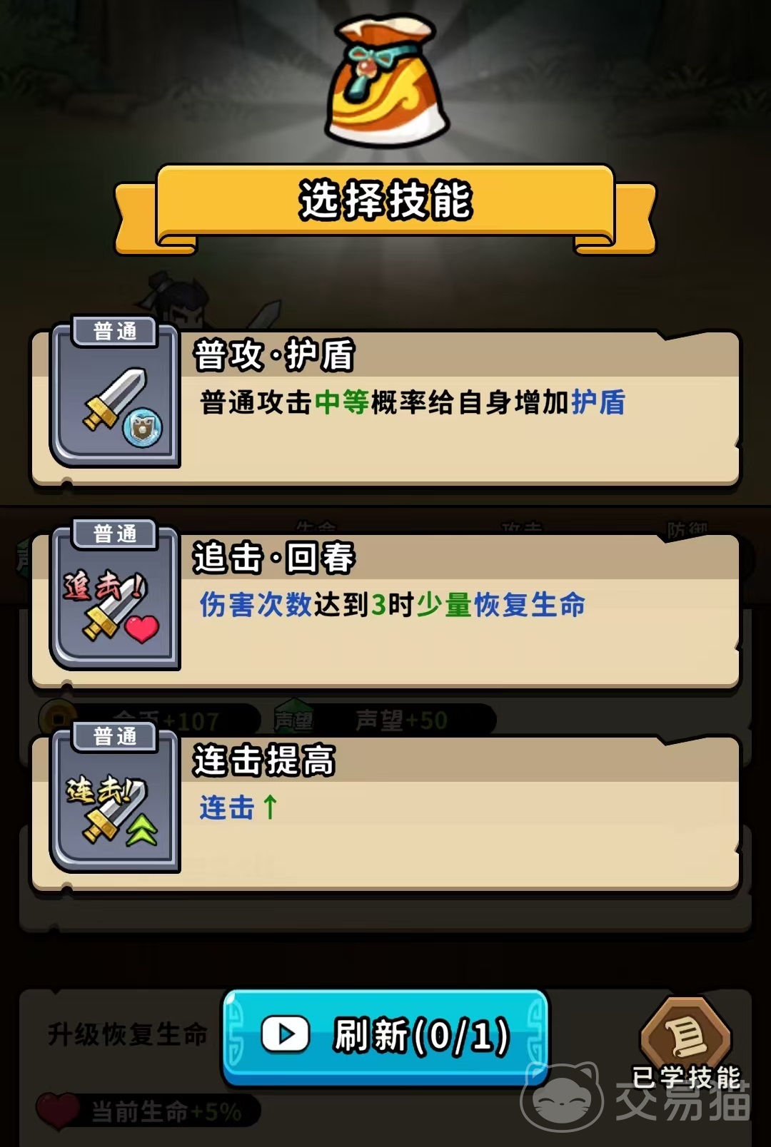 当然因为具体在实际应用过程中,还有很多细节方面的问题,例如,当出现的三个技能都和概率相关,可以选择看广告刷新,也可以选择含有永久增加概率的技能,但最好不要选择那些行动几次之后就会消失的技能,即使它们出发的概率比较高,但是也会非常浪费。