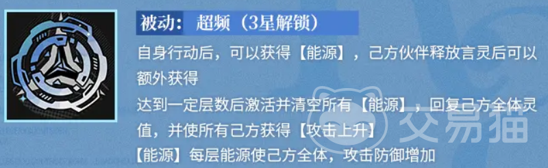 EVA的被动技能也是相当值得一提。她的“超频”技能可以让她每次行动后获得“能源”,而队友释放言灵时,她还能额外获得能源。累积到一定层数后,EVA会触发能源的爆发,回复全体队员的灵值,并且增加大家的攻击力。更厉害的是,这个技能的层数越高,提升的效果也越明显,可以说是非常适合团队作战的节奏。
