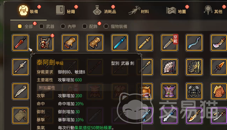 游戏里可以选择的武器装备分成多种不同的类型,每个玩家都可以选择适合自己的武器装备进行使用,在众多不同类型的装备里,剑类是使用率比较高的,每个玩家都梦想着自己能够仗剑天涯,在剑类武器里最推荐的就是泰阿剑,这是一个一品武器,想要获得这个武器玩家,就需要去找武当的清霄道长进行切磋,通过切磋就能获取这个强力的武器,搭配上六扇门的4件套可以让玩家有极高的爆发力。