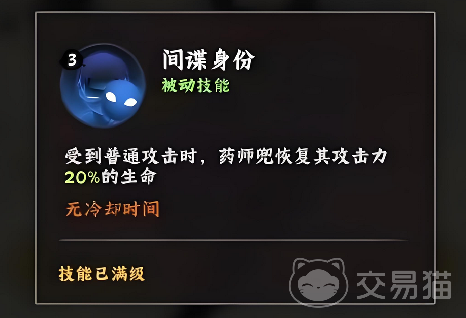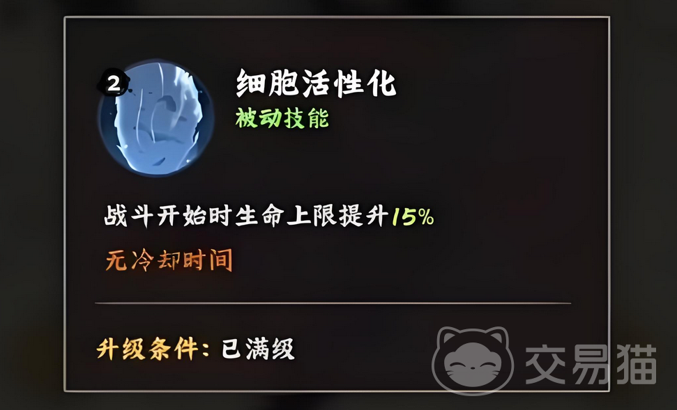 接下来是第1个被动间谍身份,在药师兜受到普通攻击时,会按照攻击力的20%恢复生命值,此效果没有冷却时间。第2个被动技能细胞活性化,在战斗开始时生命上限提升15%。药师兜的技能比较简单,两个被动主要提升的是生命恢复和生命上限,都是强化的生存能力,最大的作用就是自身的主动技能所带来的高额减速。