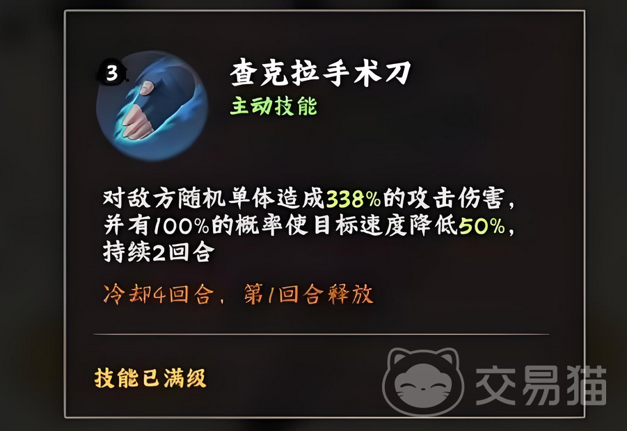 药师兜自身因为体质比较低,所以只有三个技能。第1个是主动技能查克拉手术刀,对敌方随机单位造成338%攻击力的伤害,并有100%的几率使目标速度降低50%,速度降低效果持续两回合。该主动技能在第一回合释放,有四回合的冷却时间,而且小编介绍的是达到满级之后的效果。
