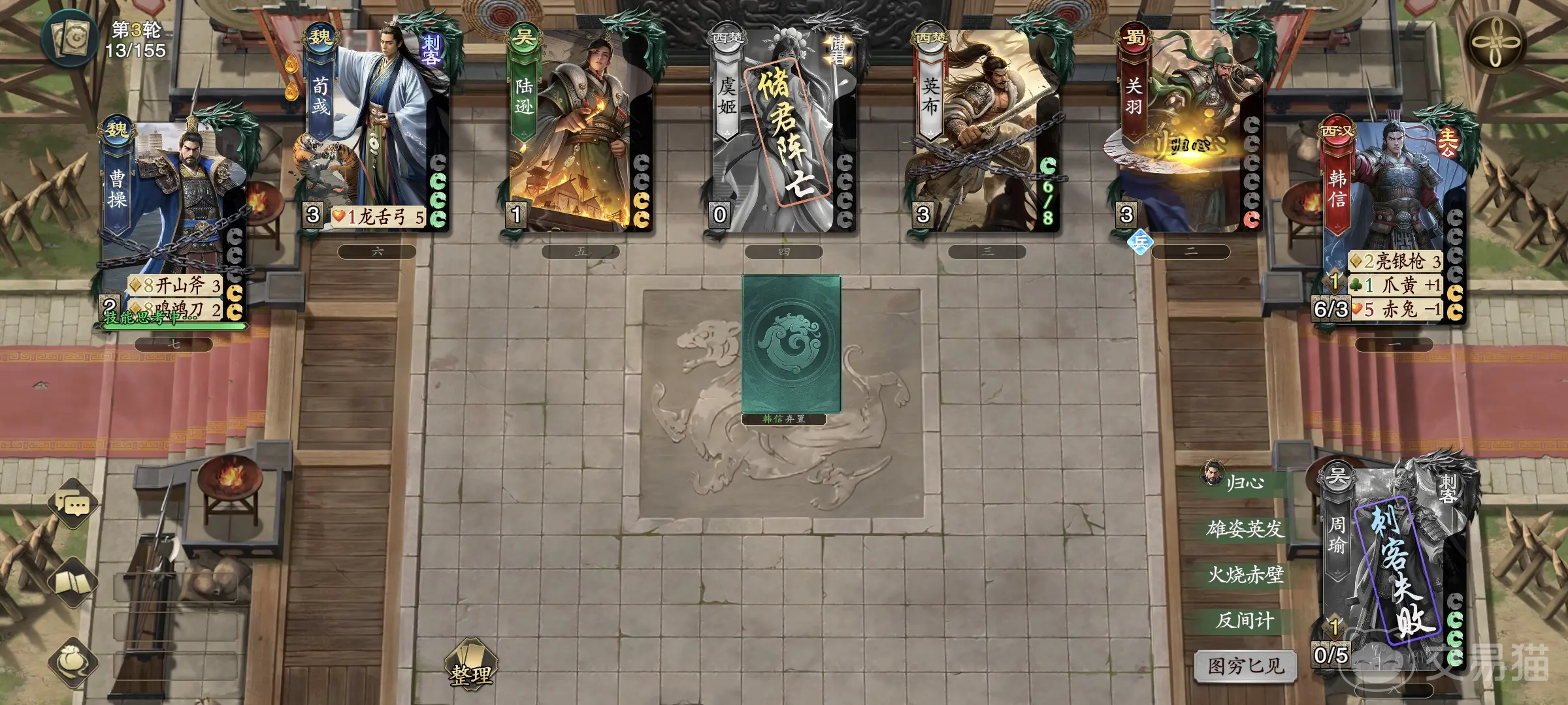 2技能“人和”,这个招式的效果有点类似于领域,可让所有己方队友都获得激将的效果,让所有玩家每回合出“杀”的次数都加1,且对场上所有的英雄都生效,该技能总体来说是双刃剑了,用的好的情况下,本队伍会占据很大的优势。总的来说,这个武将是需要和其他英雄之间展开配合,配合得当,才能发挥出他全部的实力,适合与输出伤害非常高的武将之间配合,这种光环效果能让队友获得额外的杀的机会,能较大限度的提升队友的输出能力。