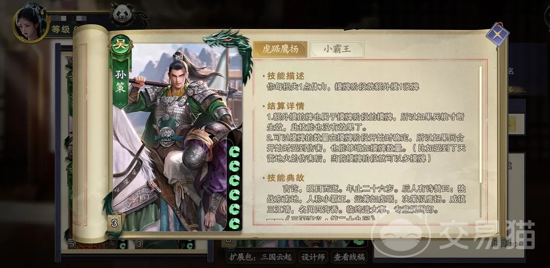 该角色的能力在于他的换血机制,核心技能“虎踞鹰扬”,这个能力每损失1点体力,摸牌的阶段必然可以多摸1张牌,在使用时他需要主动去压血,通过耗血来换牌,最好留3点血,利用过高的牌攒足决斗,当手上的牌是全场最高时,弃牌的时段一定发动2技能额外发动一次决斗,优先选择无杀的武将来压血线,对敌方造成强力的压制。