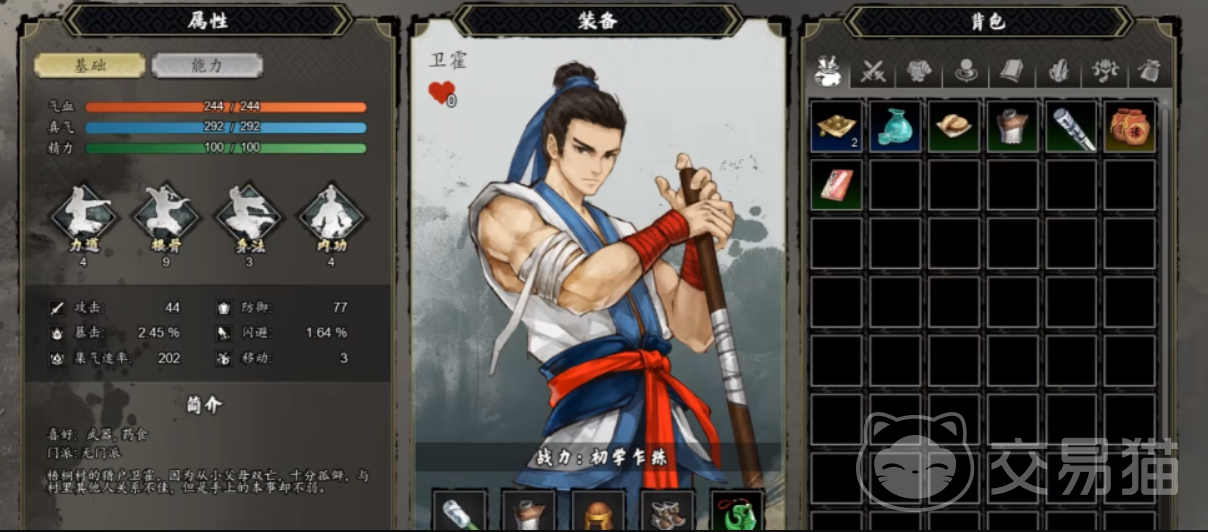 卫霍其实就是新手村赠送的,我们在过主线时会需要解毒之物高粱酒,此时跟着任务就会遇上他,最后只要送礼清虚酒将好感提升就能让其入队。