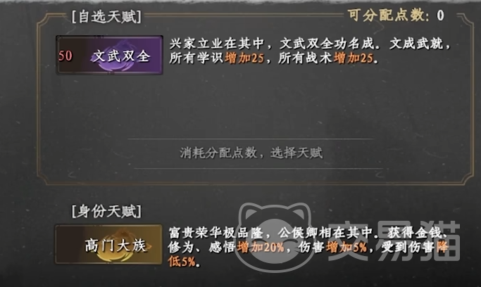 既然是完美开局,那么给我们自己增加天赋点数的肯定不考虑了。这其中点数足够的话建议需要选择太阴和太阳这两个,这两个天赋会让我们本身在修炼任何功法都有着极高的优势,同时在发挥战力方面也比一般的要强上许多。基本上只要可以选中这两个天赋的话就可以算得上完美开局了。其余的天赋玩家们如果还有着天赋点数的话可以酌情进行考虑,接下来选择一些非战斗属性,接着选择难度便可以进入游戏。