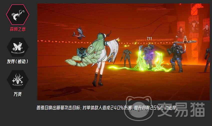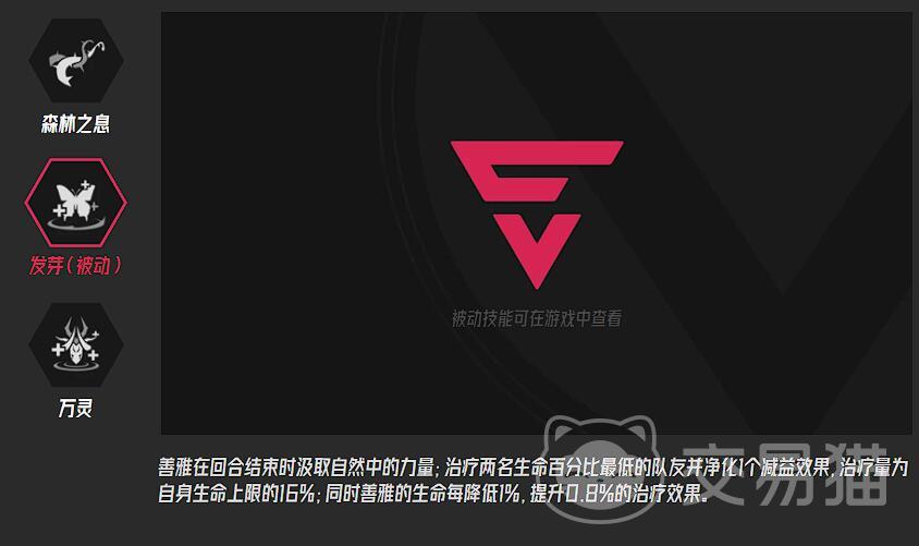 善雅的核心定位是“持续续航型治疗”,技能设计全围绕“帮队友稳住血线”展开。主动技能“森林之息”看似是攻击——召唤藤蔓抽敌人一下,造成240%的伤害,但其实重点是后面的“提升自身25%行动速度”,这样她就能比队友更快行动,提前准备回血,被动技能“发芽”是她的招牌技能每回合结束时,会自动锁定队伍里生命值最低的队友,给对方回自己生命值上限16%的血,同时还能去掉对方身上的负面效果(比如中毒、减速、眩晕这些),相当于每回合都有一次自动救急。