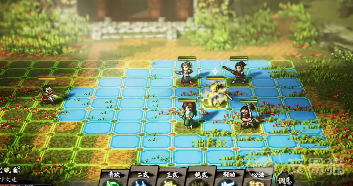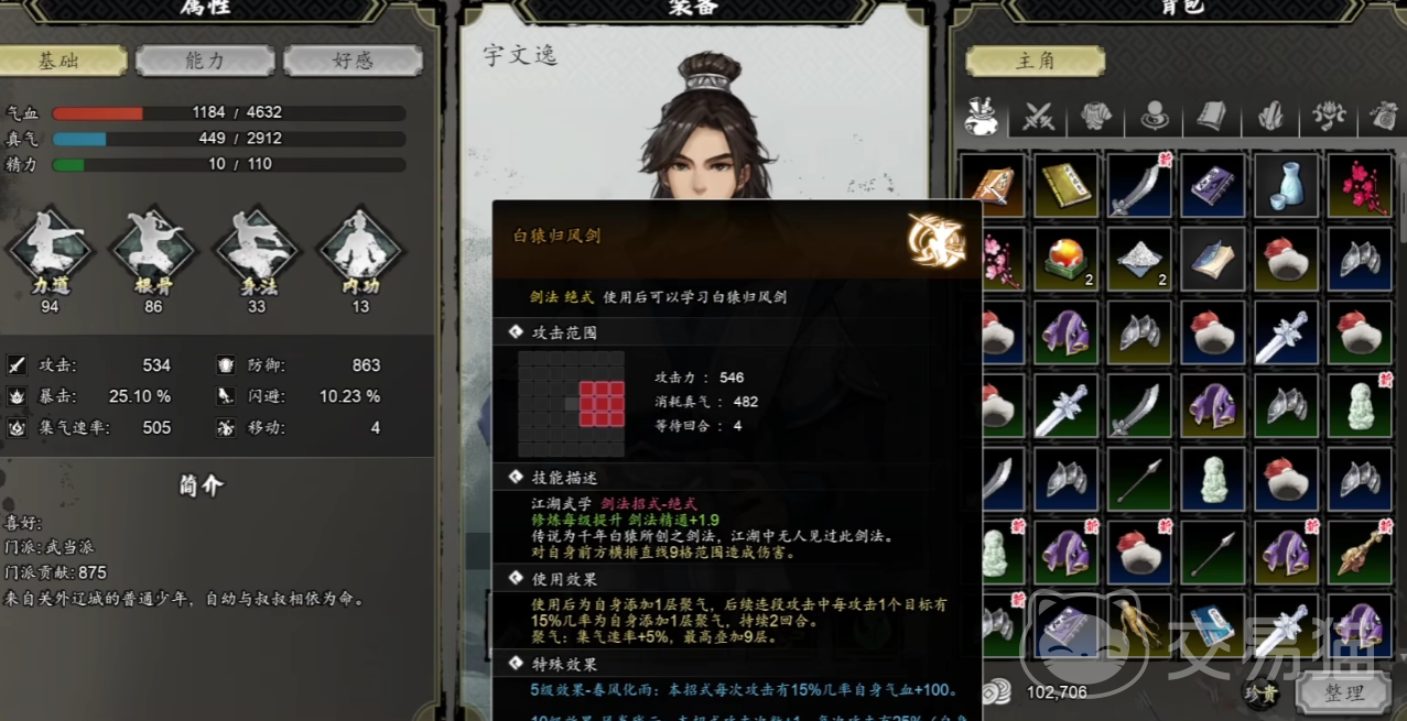 白猿追风剑的剑法,其基础效果是,可以对前方横排九格的范围目标,造成aoe伤害,在伤害达成后,还可以让自己增加一层聚气的效果。