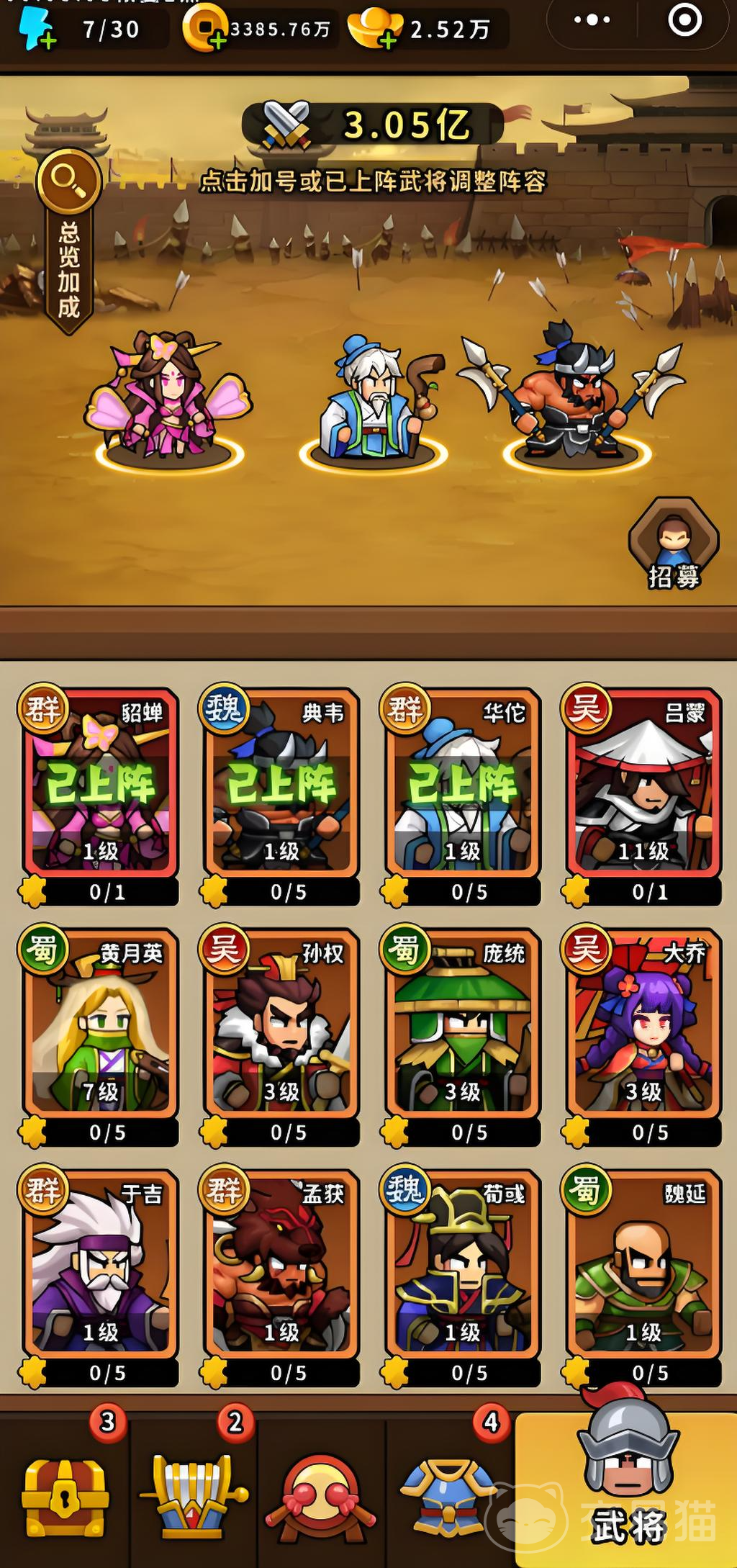 阵容的组成就是一个不能分配调动的主角加上四个可调动的武将,这些武将都可进行搭配不同的装备和位置来提高整体的战斗效果,要是玩家们可以将ssr作为中心进行搭配就可打造出超高战斗力的阵容,在武将的选择方面建议大家可以使用吕布和曹操这类角色,对于后续的养成和阵容搭配都有很好的提升效果。