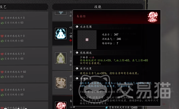 易筋经在这个游戏里所属的是心法,作为少林心法玩家,每一次进行修炼都可以提升相应的经脉数值,比如在游戏里玩家进行1级修炼就可以提升59点的经脉,除了常规的经脉提升之外,还可以提升65点气血上限和85点真气上线,这样就可以让角色本身的能力更加优秀,但需要注意的是这个功法没有办法施加给其他的队友,只能玩家自行使用,每次在使用之后,除了这些作用之外,还可以恢复自身的血量,同时把对方施加在自己身上的负面效果也直接清除。