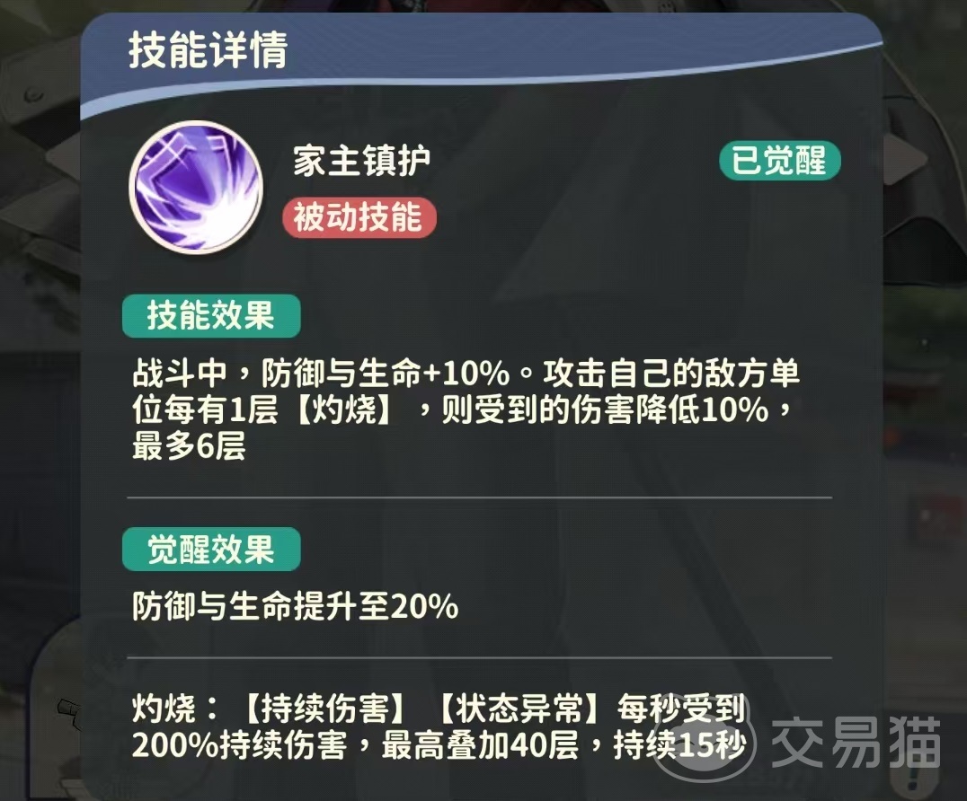 第1个被动技能家主镇护,在战斗过程中,解雨臣的生命和防御提升10%,如果对方攻击解雨臣,那么敌方身上每带有一层灼烧,解雨臣受到的伤害就会降低10%,最多计算6层。所以将对方的核心输出灼烧叠加起来之后,对方就很难对解雨臣造成有效的伤害了,在觉醒之后,防御和生命值的提升效果能达到20%。第2个被动海棠灼灼,己方施加的灼烧状态伤害提升,灼烧能无视对方的部分防御,并且对拥有血盾的目标造成额外的伤害,这个技能就非常克制拥有护盾的敌方目标。