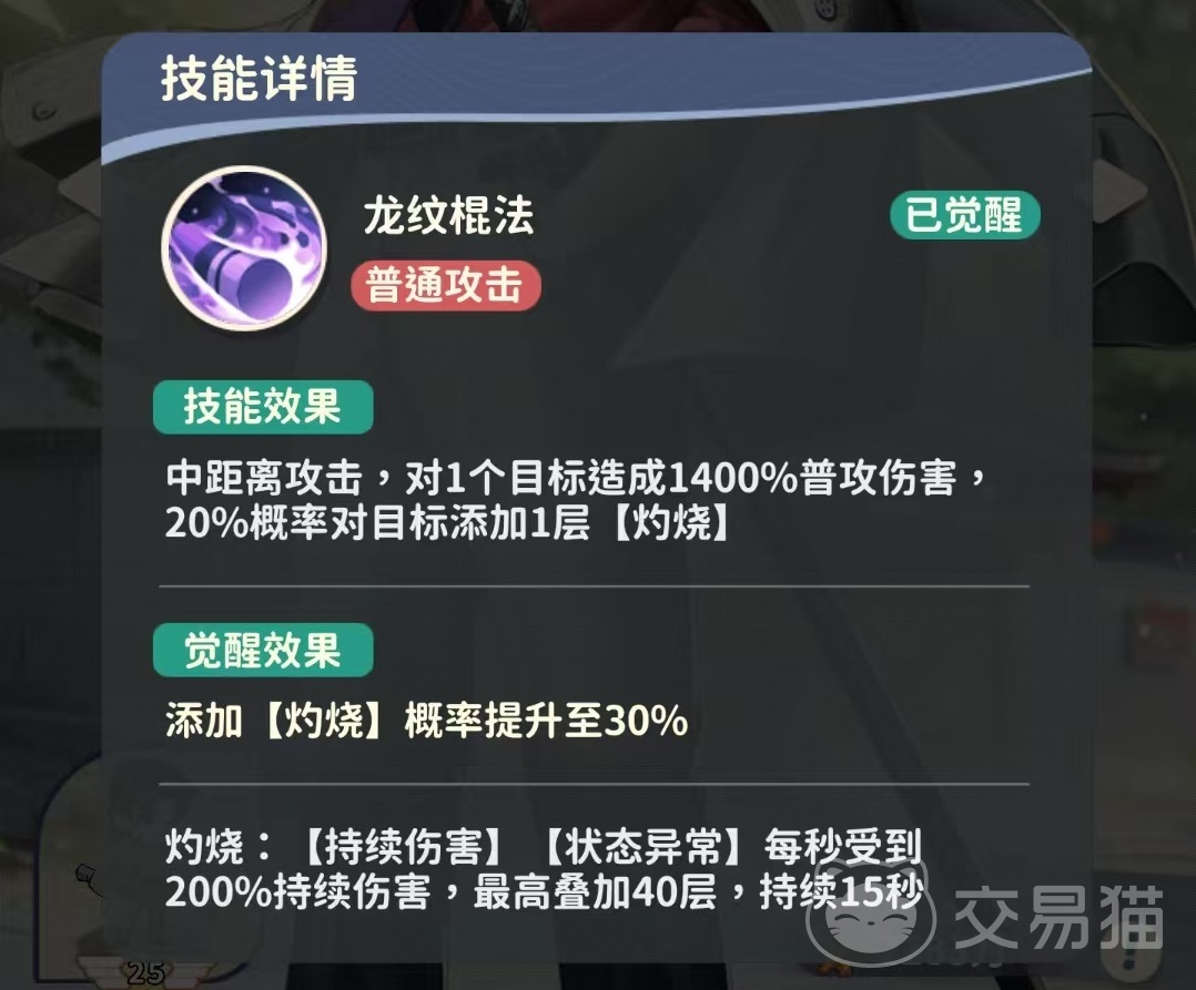 解雨臣的普攻龙纹棍法,中距离攻击,可以对目标造成高额普攻伤害,并有20%的几率对目标添加1层灼烧,在觉醒之后,灼烧的附加几率可以提升到30%。灼烧这个效果是属于持续伤害和异常状态,使对方每秒钟受到持续伤害,最多可以叠加到40层。主动技能劈山断水,对敌方随机三个目标造成高额技能伤害,并对目标添加1层灼烧,觉醒之后灼烧效果可以增加到3层。