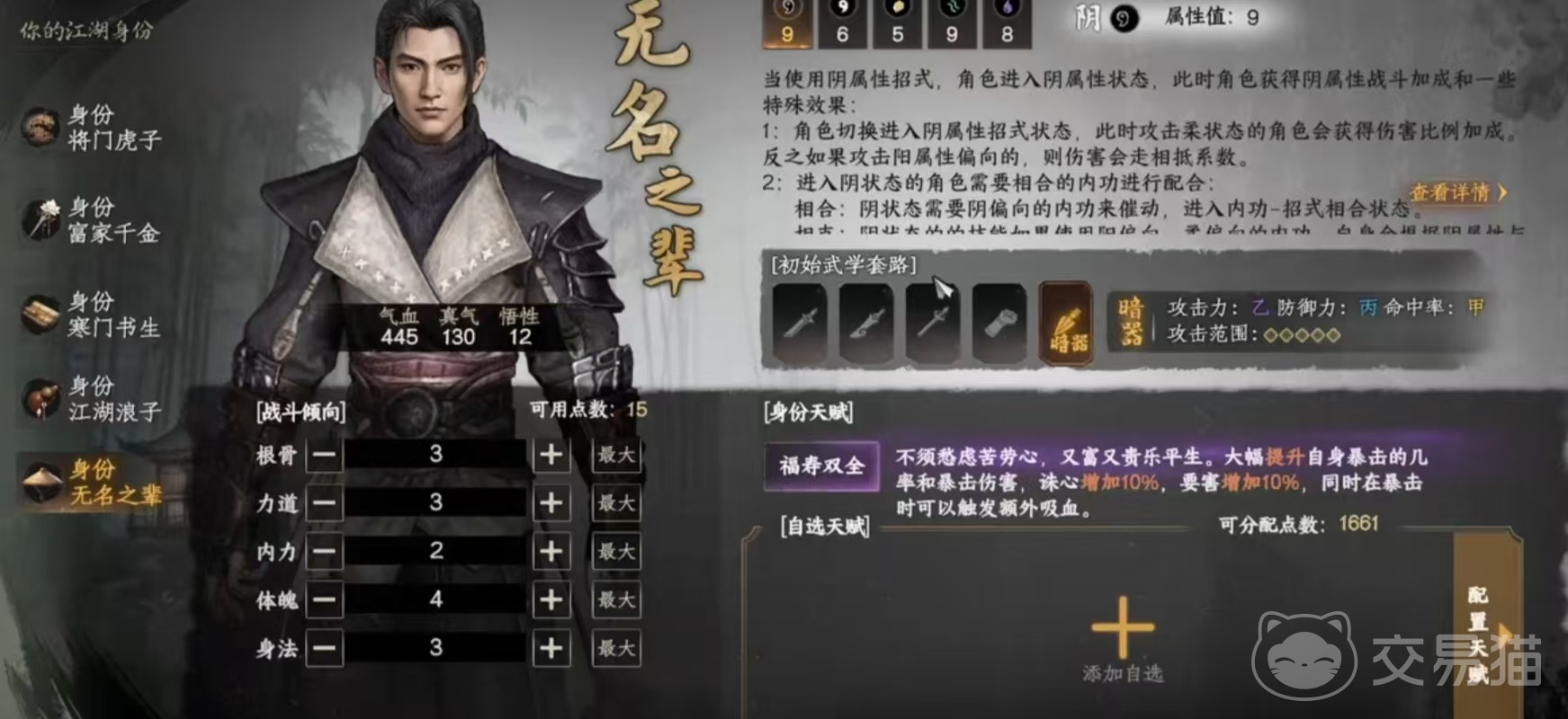 首先是游戏的角色成就。目前有五种身份可以选择,分别是将门虎子、富家千金、寒门书生、江湖浪子、无名之辈。每一个身份对应不同的剧情。新手建议先从将门虎子的剧情开始玩,难度呈梯度上升,上手更容易。人物自身的成就是指玩家在游戏里通过打造武学体系、锻造装备等提升实力来达成成就,比如说用将门虎子的身份,当根骨达到250点后,就会解锁成就,这个成就会产生一个天赋点。其他类型的成就同理,总之就是跟角色相关的属性成长到一定阶段,就会解锁成就。