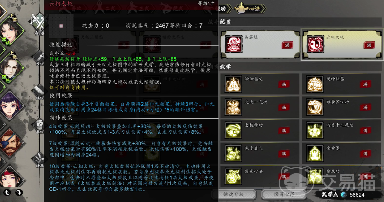 云相太极属于被动心法,需要装备才能够生效,其触发条件是,玩家绑定太极神功,亦或是四象无极功时,会触发增益效果,四级自带开局太极buff,每一层可以提升武当刀法,亦或是玄虚刀法的伤害,太极的反制性伤害,会进行翻倍。