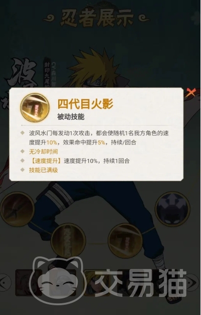 四代目火影则是让他在每次攻击时,都会给随机一位队友带来速度提升10%,效果命中提升5%,速度提升10%,这一技能不仅提升了自身的攻击收益,还能对我方队友进行属性加成,再加上致命节奏这个被动,在战斗开始时攻击提升20%,速度提升20%,暴击率提升20%,更是让波风水门在战斗初期优势加大。