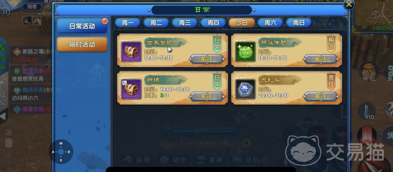 限时活动也不容错过,中午12:00 - 12:30的世界首领和下午18:00 - 19:00的帮派传功,一定要准时参加,使用经双倍经验丹等,利用高收益任务时段进一步提升经验。