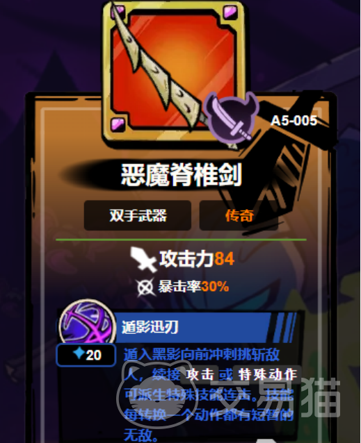 双手武器恶魔脊椎剑,技能附带移位以及无敌效果,拥有相当流畅的连招作用,作为机动性以及伤害性都非常高的大剑武器,有非常优秀的手感。英雄在释放史诗级技能时可直接格挡众多的伤害,甚至也能快速充满蓄力条,非常适合快节奏战斗。附魔非常推荐蓄力节奏以及集中。
