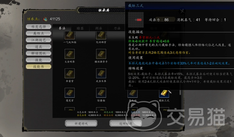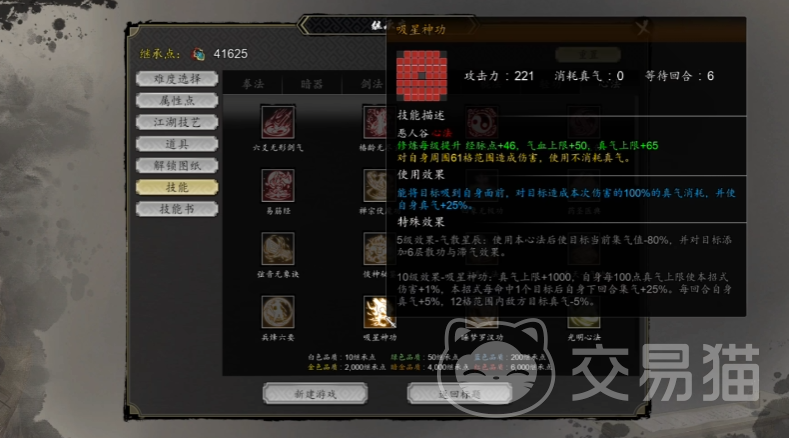 心法的选择与继承同样关键,,易筋经作为一种强力的心法传承,对提升角色输出能力效果显著,在二周目开始时若玩家将部分继承点用于解锁易筋经,能让角色在战斗中的输出表现得到质的飞跃,在面对前期敌人时更具优势,武功流派的构建需要玩家根据个人喜好来分配继承点,游戏内存在多种武功流派,每个流派都有其独特的武学招式与战斗风格,玩家确定心仪流派后,可挑选该流派核心武学进行继承。