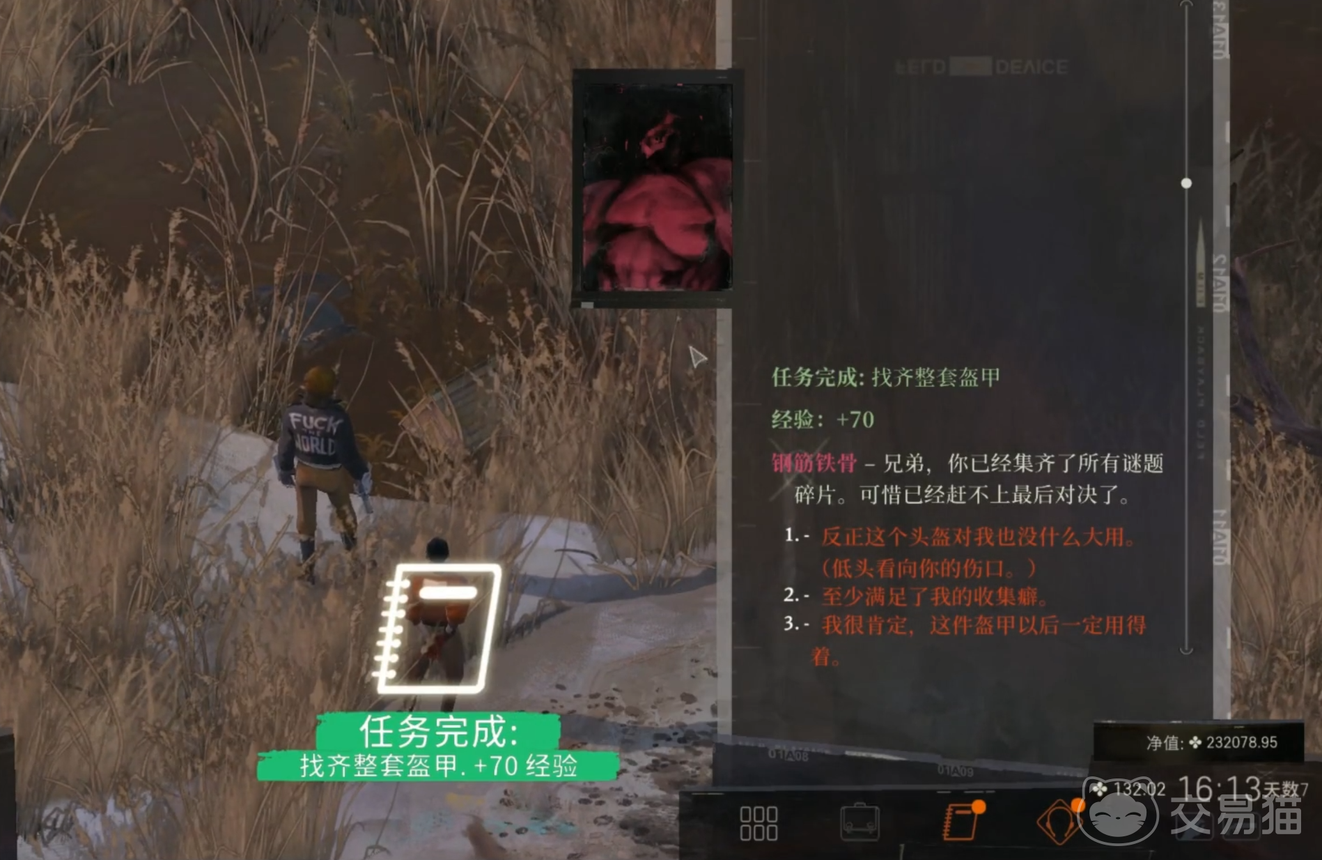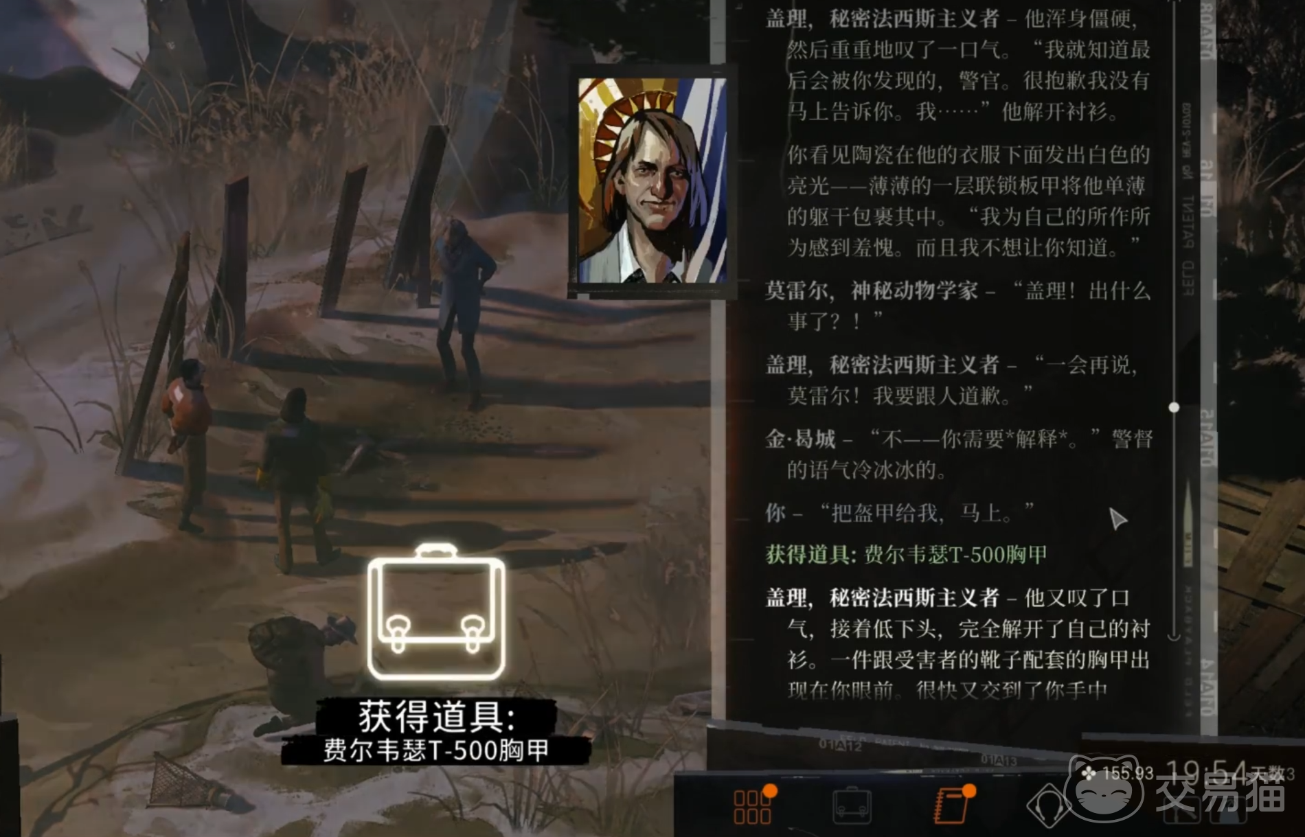 然后就是盔甲。盔甲的获取一般在游戏的第三天,我们通过任务与对话,解锁渔村之后,便可以来到渔村,找到盖里,也就是那个留着长头发的男人。我们与之交谈之后,会有一项“从容自若”的判定,这里小编推荐至少要达到5,才能百分百的完成判定。之后盖里就会给我们T-500的胸甲。