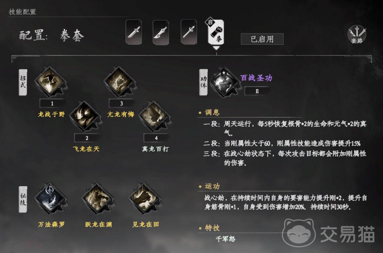 增益类的功法选择八极劲以及御气九万里,八极劲减对面输出,御气九万里加移速;两者的综合效果降低对面的整体输出能力,同时提高自身的机动性,这样可以提高降龙拳法的命中率。