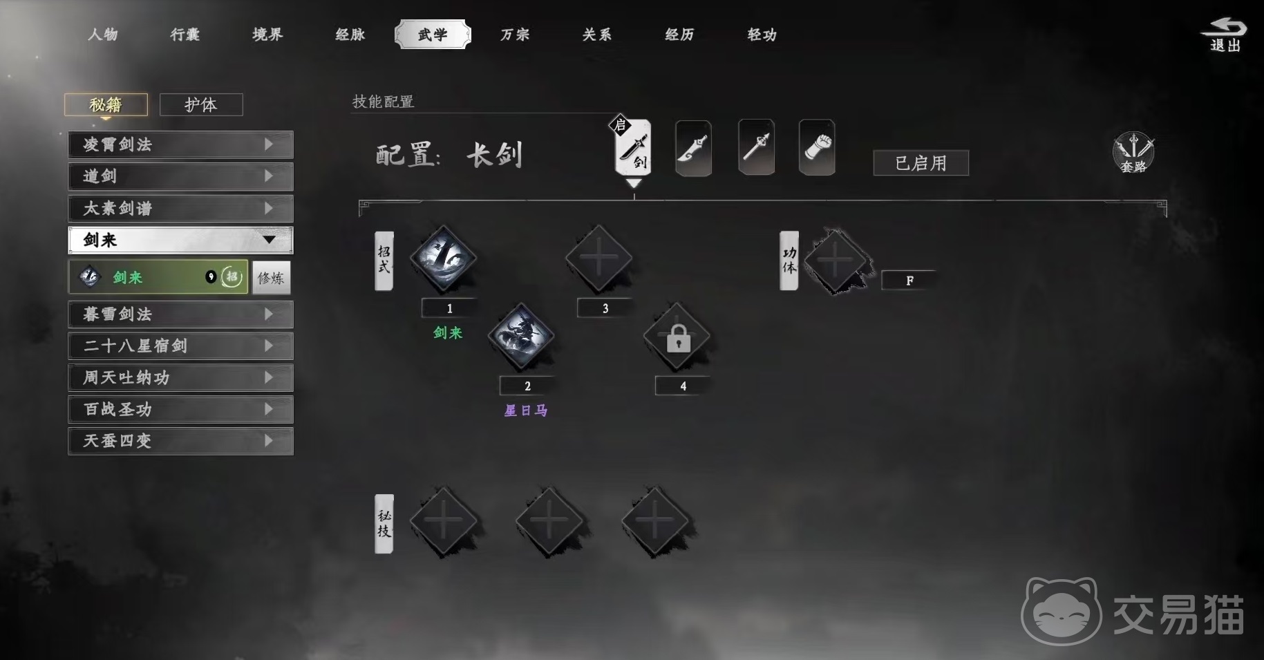 该秘籍学会之后,核心招式就是剑来,在使用时会扔出一把剑,自身附加各种增益效果,该技能冷却时间15秒。技能主要效果是为自身强化属性,有着多种不同的附加状态。例如攻击时额外放出一把飞剑,附带额外伤害,放出飞剑时会额外再放出两把飞剑,使用技能时额外放出一把巨剑。还有剑气护体,释放技能时可免疫一切伤害等。在领悟条件方面,无论是入门还是熟练以及精通,都无需特定条件,消耗感悟就可以进行领悟。