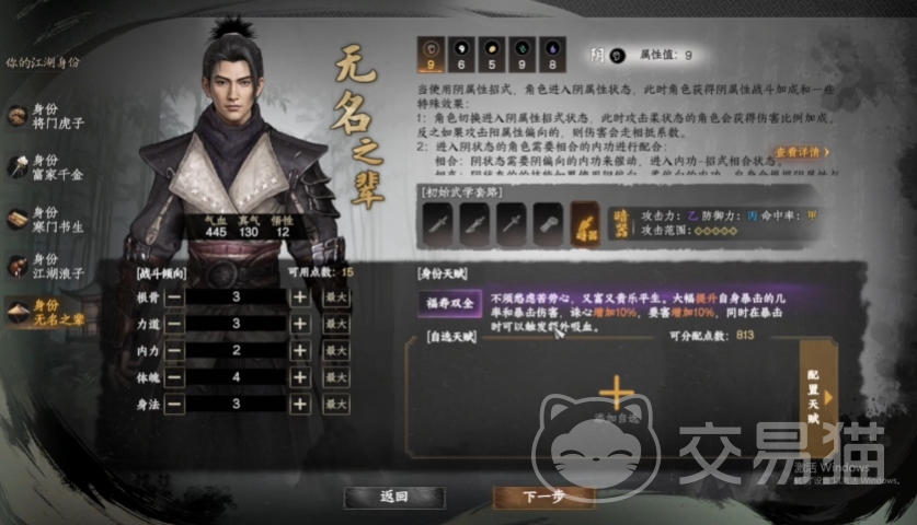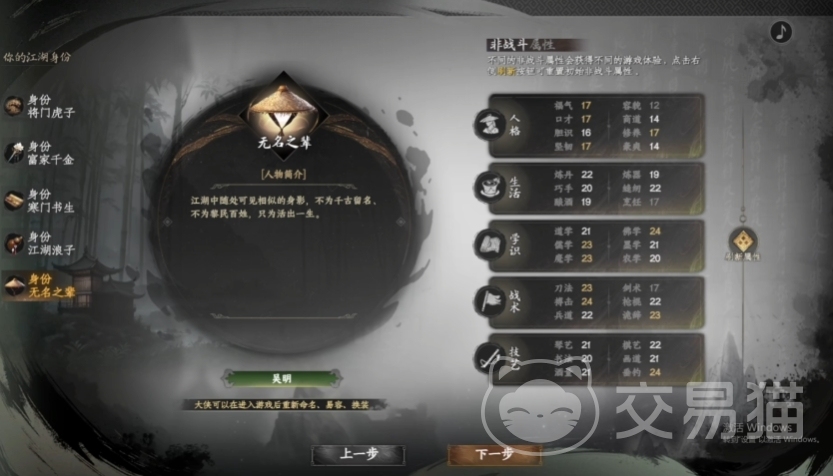 寒门书生与酒楼小厮则聚焦于资源经营维度,两者均在金钱获取上拥有加成,却在其他属性上各有取舍,寒门书生因十年苦读的积累,在前期金钱获取效率上优势明显,但修为与感悟的增速相对缓慢,需要玩家在成长过程中合理规划资源分配,通过购置秘籍、请教名师等方式弥补武学短板,适合擅长长线规划、注重策略经营的玩家,酒楼小厮则凭借市井历练的敏锐嗅觉,同样享有金钱加成虽修养与口才属性略有不足,但前期积累的财富可快速转化为装备提升、药品储备等实用资源,为后续探索与战斗奠定物质基础。
