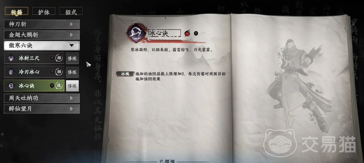 最后是傲寒六诀的最后招式——冰心诀。作为一项高效的状态类技能,冰心诀的主要作用是通过施加蚀阴效果,持续压制敌人的战斗力。其强化效果“冰魄”能增加蚀阴层数的上限,每次造成伤害时,都会对周围敌人施加额外的蚀阴层数。这意味着,冰心诀不仅能够单独打击敌人,还能通过持续叠加状态,削弱敌人的防御能力,制造出极强的控制效果。对于喜欢持久战斗并依赖状态叠加的玩家来说,冰心诀会是提升战斗节奏和掌控战局的关键技能。