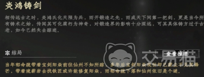 在获取天外飞仙的过程中,玩家还会触发仙洲地宫一系列与“炎鸿铸剑”相关的支线剧情。该剧情起点在云潇山庄,玩家需与多个NPC互动,获取线索,最终通过推理整合信息,完成一把名为“阳焱”的宝剑的重铸。这把剑不仅是剧情的关键道具之一,也是在后续地宫探索中推进任务的必需品。