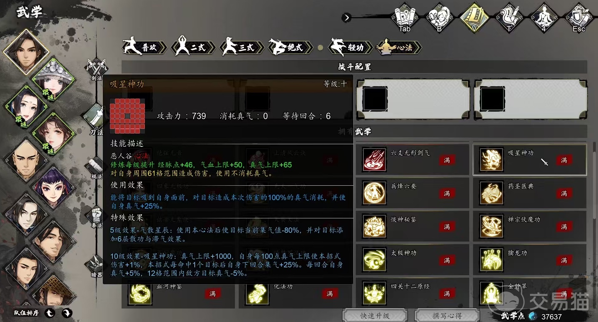 吸星神功升到5层时,触发效果气散星辰,使用吸星神功后目标当前集气值大幅度降低,并对目标添加6层散功和滞气效果,学到10层时触发效果吸星神功,自身真气上限加1000,自身每100点真气上限,可使本招式伤害加1%。在命中一个目标后,自身下回合集气加25%,每回合真气加5%,12格范围内敌方目标真气降低5%。能够提升己方续航,大大削弱对方的输出能力,是吸星神功最大的优势,强行集体抽篮和降低对方的集气都削弱了节奏。