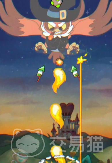 第三个boss是猫头鹰探长,他的攻击技能和大笨钟非常类似,可发射扇形的愤怒小鸟,而在进阶状态下,这些小鸟还会发射子弹,且其翅膀煽动的同时可改变气流。此时玩家可以选择喷射枪来对准气流轨迹,进行粉弹发射,大大提升了几种boss的命中概率,对其发射的小鸟导弹,可通过环绕飞行方法,进行躲避和反击。