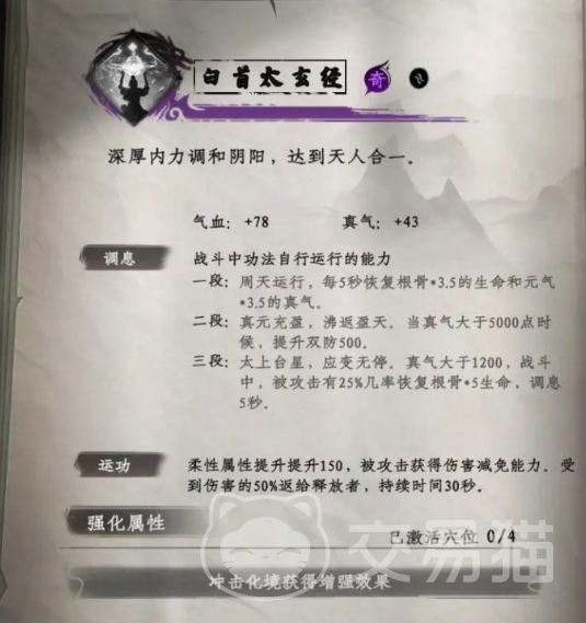 第三部秘籍是周天吐纳功,通过完成主线内容就能够自动获取。在战斗当中,该工法可自行运作,在吐纳调息后,则可以大幅度回升自身的气血值和真气值。
