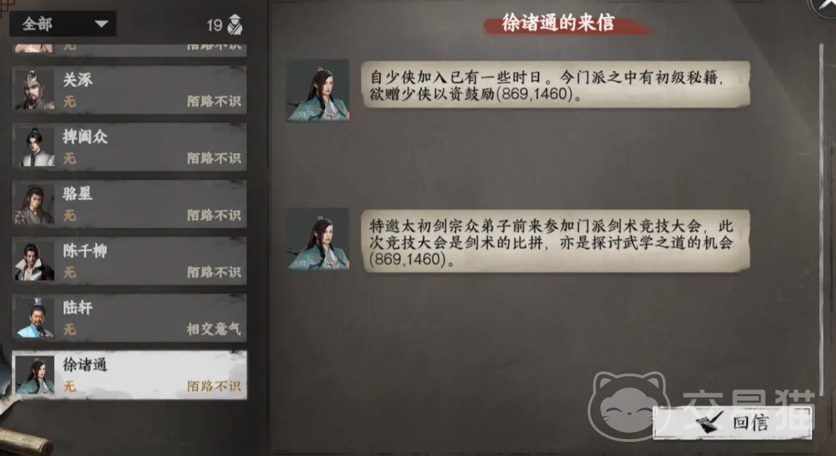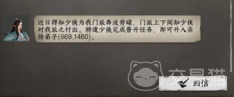 晋升的脚步不会停止,在你积累了更多的门派好感,并将其提升到50时,徐诸通会再次向你发出飞鸽,这次是要求你进行一场切磋,和盛文星对战。通过这场挑战,你将顺利晋升为关门弟子,为自己开启了更高的修行篇章。