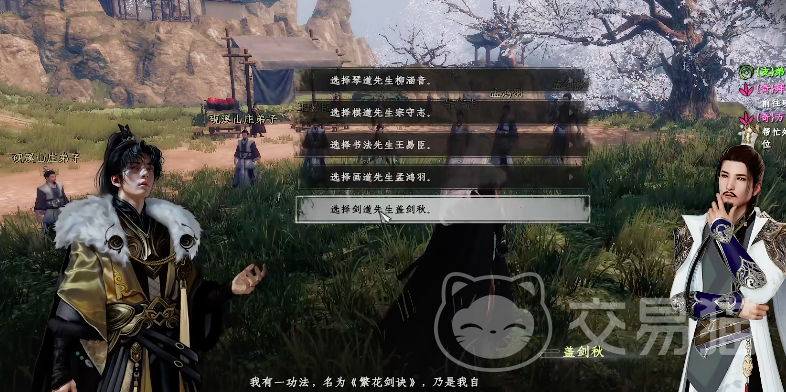 这时候玩家就可以参与弟子大会,连胜4场就可以选择拜师,一共有5个人可选择。如果玩家想获得繁花剑诀,就必须要拜最后一个人盖剑秋,如果拜其他人的话会获得4个护体,以绝技分别是潇湘水云、晨星流转、砚海潮生、化境神游,所以需要玩家选择正确的拜师模式。