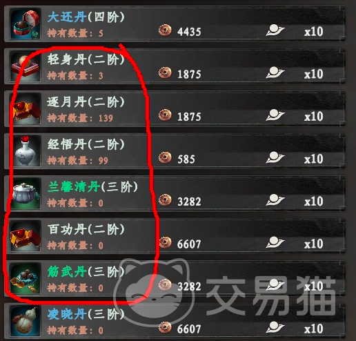 还可以前往小石镇丹师处进行丹药购买,但是的位点在(724,767),小编在图中圈出的这些丹药都可以进行感悟值的提升,不过需要玩家注意,小时镇附近会有一些怪兽想在这里刷感悟的话,建议将修为和感悟都提升到200万再进入,非常适合中后期的玩家们进行尝试。
