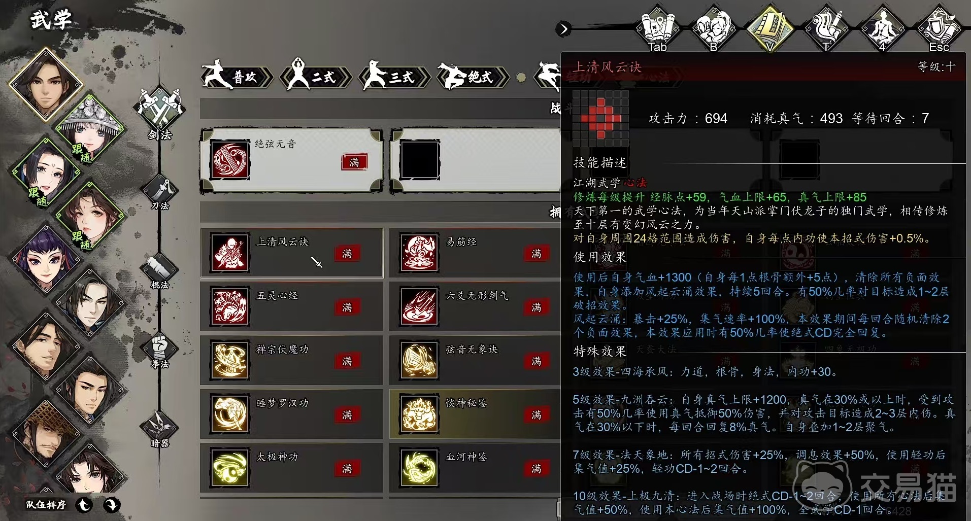 风起云涌是很好的buff加成,提升25%的暴击和100%的集气速率。在此效果持续期间,每回合还能随机清除两个负面效果。上清风云决升到3级时触发四海成风,使得自身的内功、身法、力道和跟骨都能提高30点。升到5级时触发效果九州吞云,大幅度提高自身真气上限,在真气达到30%或以上时,受到攻击时有几率使用真气来抵御伤害,并对攻击目标附加内伤。在真气处于30%以下时,每回合可恢复真气并叠加聚气。升到7级时触发效果法天象地,所有招式伤害增加,调息效果增加。10级触发上极九清,进入战斗时,使用所有心法后集气提升。