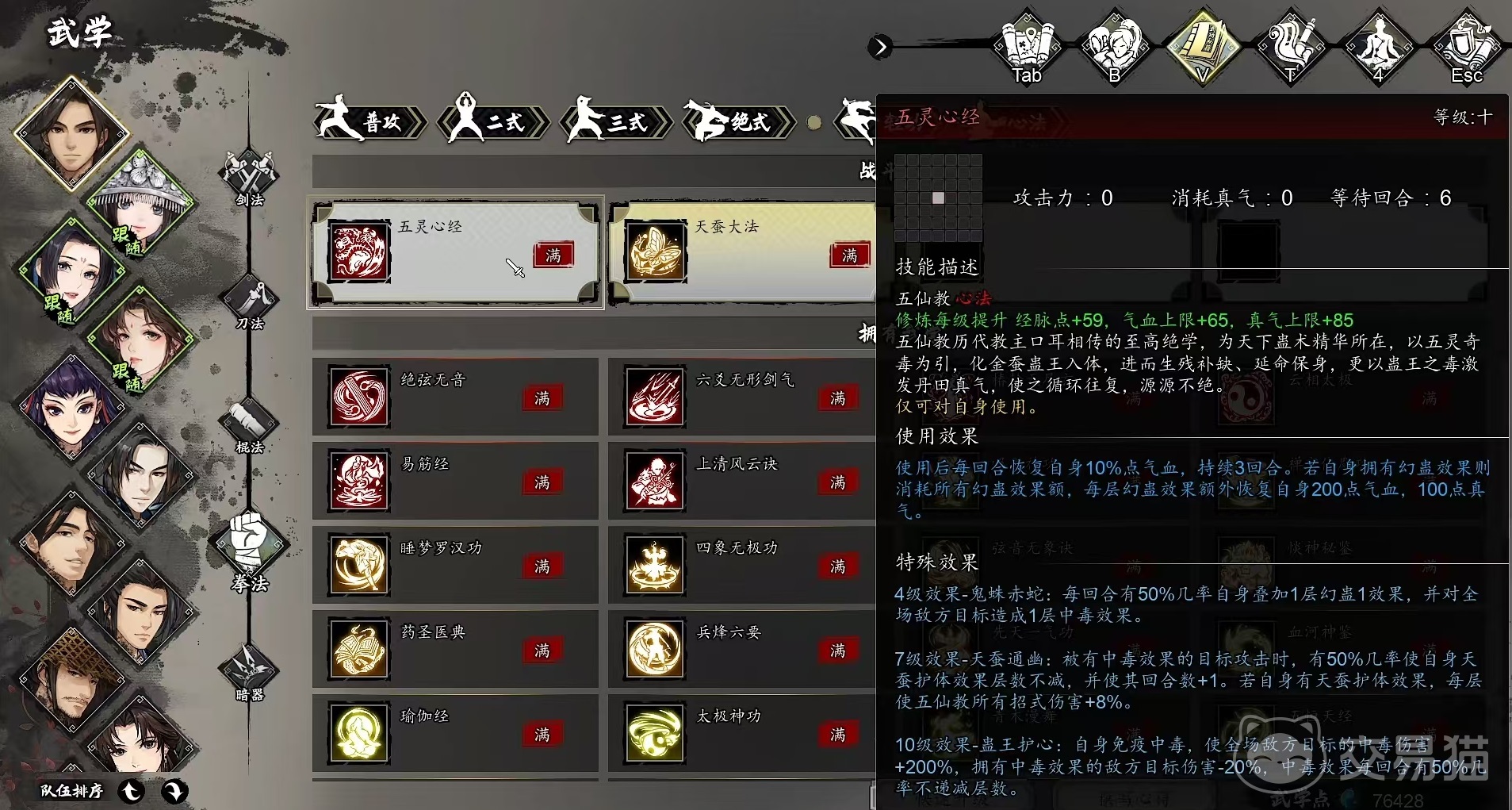 五灵心经达到7级时,被有中毒效果的目标攻击,就有几率使自身的天蚕护体效果层数不减并增加1回合。达到10级时自身免疫中毒,使场上的全体敌方目标中毒伤害提升。在实际应用的过程中,五灵心经适合多种不同的流派,不同流派有着不同的搭配方式,主要都是为了发挥回血、增伤等一系列效果。比如可以和刀系流派配合使用,搭配上睡梦罗汉功、易筋经和四象无极功。利用四象无极功提升刀系输出,睡梦罗汉功提供闪避和回血,强化生存。易经经提供生存保障,五灵心经进一步补充气血,增加战斗续航。