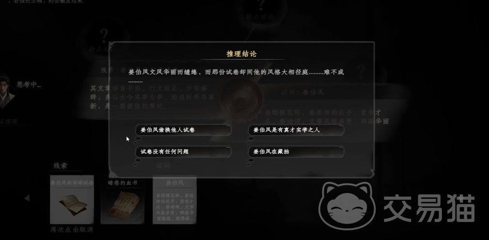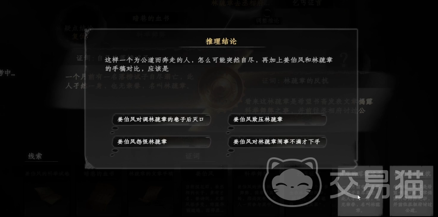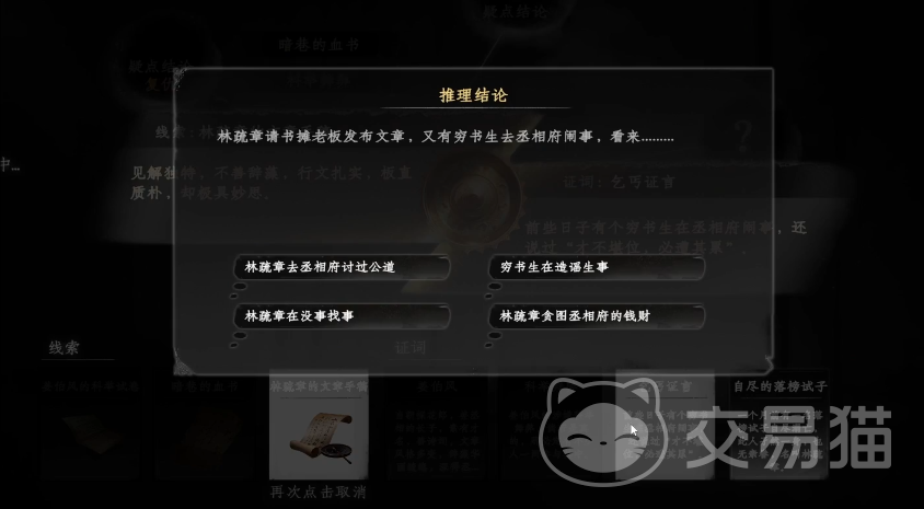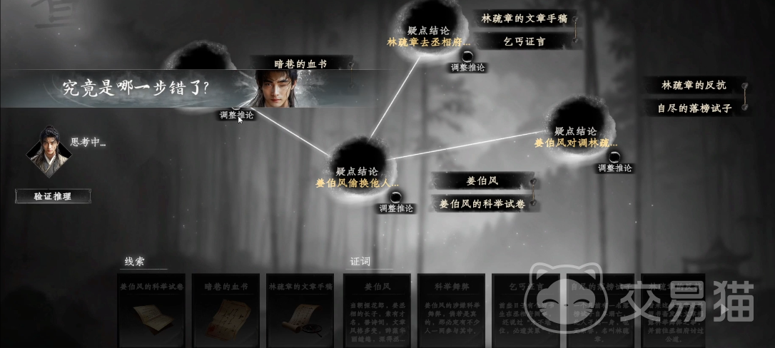 以上就是下一站江湖2淮陵谜案怎么解的步骤分享了,关于这个谜案的解谜过程中线索是比较好搜集的,稍微繁琐的步骤是在于论证的过程,一旦论证顺序不正确就会导致最后的结论答案无法选择,因此建议玩家按照上文提及的步骤来进行论证,这样的论证方式能保证玩家不重复论证,能快速完成整个谜案的解谜过程。