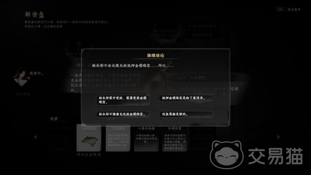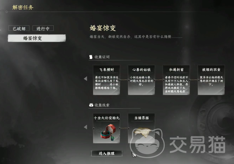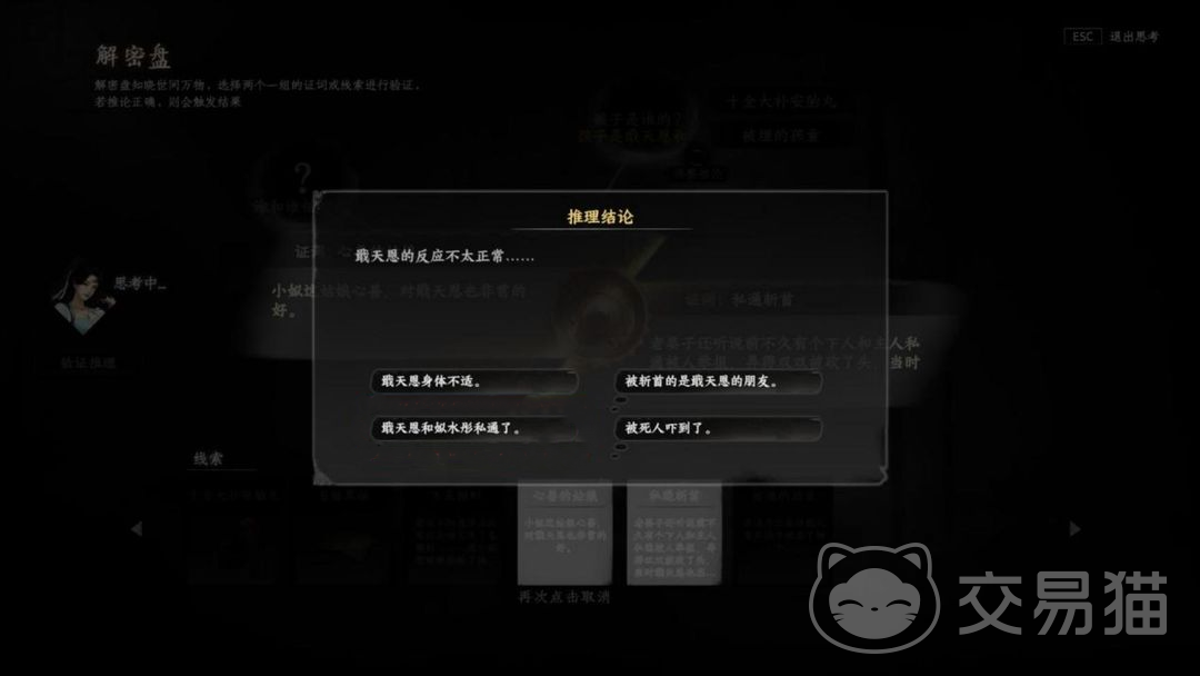 7、成功击败长天逸后拿到新线索,紧接着询问长天逸是否还需要战斗,他会选择拒绝,接下来又是一长段的剧情,剧情结束后达成整个婚宴的线索搜集过程,这个时候剧情会提示玩家进入线索推理阶段,这是任务能否完成的关键。