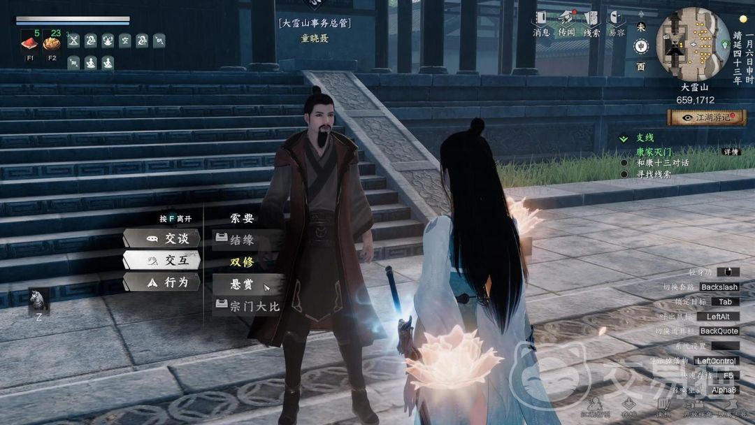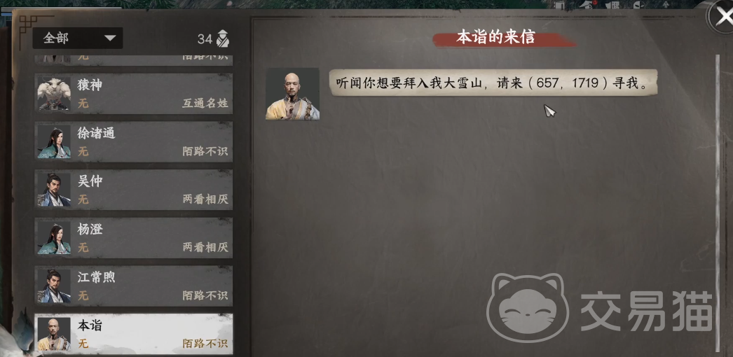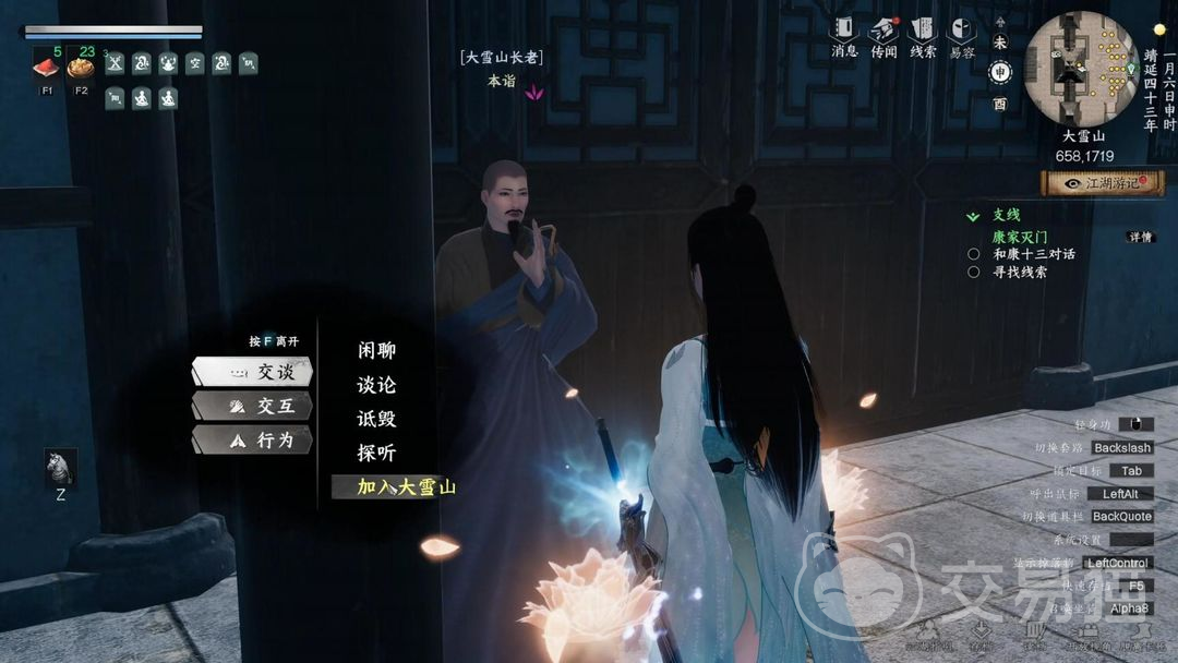 想要加入大雪山门派的话,只要找到关键NPC澄心,触发和他的对话,他会提出一个问题:如何看待佛学。走完剧情后拿到佛学武功【伏明棍法】。收到邮件指示到坐标(658,1719)与本诣交谈“加入大雪山”即可成为大雪山外门弟子。