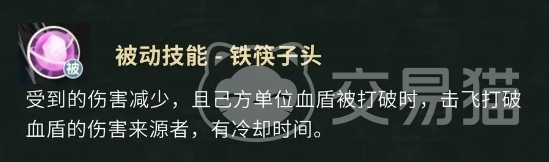 除了上述两个主动技能外,吴三省的被动技能同样作用不小,且被动数量多,所以如果实战的话用他上场面大家也可以得到很多不一样的能力加成,首先是铁筷子头这个被动,主要效果是在吴三省作为对面主要伤害目标的时候触发的,只要他受到对面的伤害,就可以减伤,这个效果其实增强了他作为前排肉盾的生存能力,不仅如此因为之前的技能是可以增加血盾防御的。