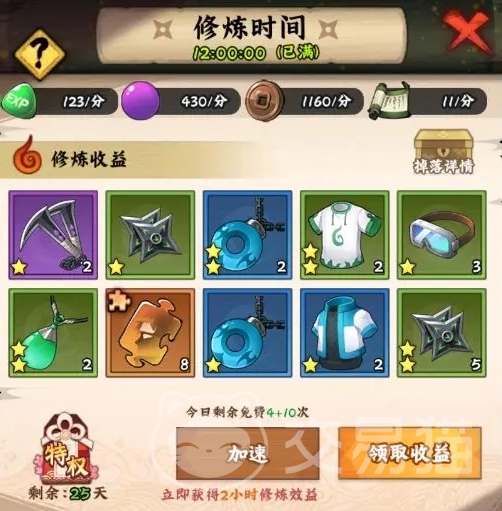 基本上完成以上这些内容后,任务那边就可以领取当天的活跃奖励,把前面这些步骤收集到的资源都汇总一下,接下来就到了养成操作的环节,该升星的忍者就赶紧升星,该升级的装备什么的也别落下,战力提升之后,日常刷本就可以安排起来,可以先去挑战最新能挑战的副本,然后直接一键扫荡就行,不过这里有个小细节要注意,还可以利用前期赠送给新手的忍币来提升扫荡的次数,这里大家就根据自己资源的多少来确定是否要提升次数。
