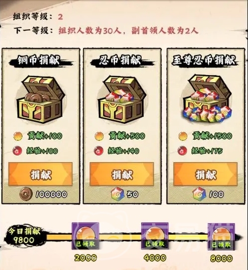 还有组织任务,此时也是建议完成的,在组织捐献的时候,建议大家选择最后的100忍币捐献,捐献完毕之后,大家的组织等级就会提升,然后别忘了把尾兽挑战也完成,剩下还有那些有红点的内容,像竞技场、摇奖、商店购买之类的,都得一一完成,把这些都搞定之后,基本上每日的流程就差不多了,最后记得招财活动也点满,然后别忘了忍具合成一下,到这儿基本上一天的任务已经完成啦。