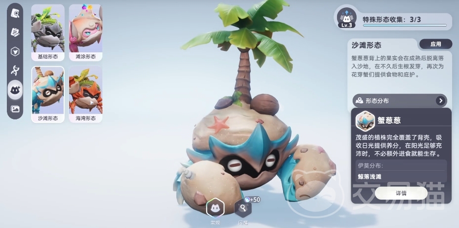 蟹葱葱:属性为土,它的贝壳上可是长满了茂密的植物,就像一个小小的移动花园,这些植物在阳光的照耀下,进行着奇妙的光合作用,使得蟹葱葱只要吸收充足的阳光,就能给自己提供一定的养分,哪怕在没有食物的情况下,它也可以靠着阳光顽强地生存下去。