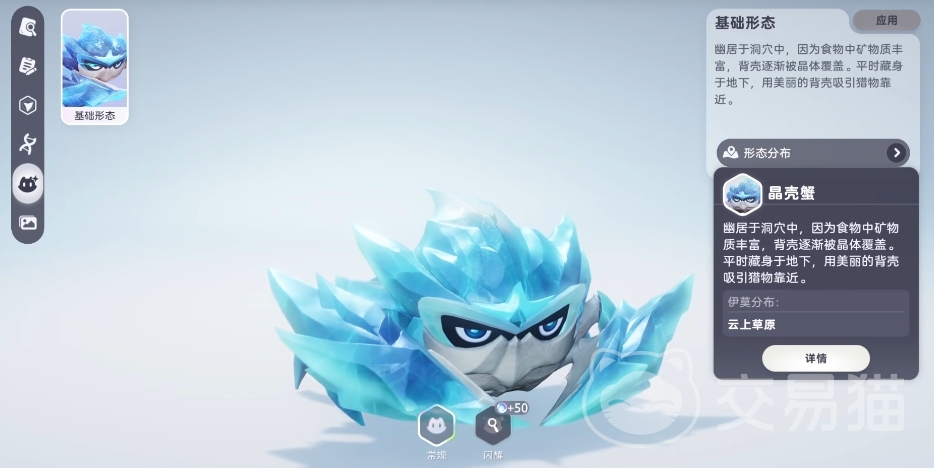 晶壳蟹:属性为冰,它其实是蟹葱葱的进化形态,晶壳蟹总是喜欢居住在幽深宁静的洞穴里面,那里光线昏暗,它的贝壳因为所食用的食物中富含各种各样的矿物质,在这些矿物质的滋养下,经过长时间的积累,它的贝壳逐渐被晶体包裹,晶壳蟹平时还会藏在地下,它的分布地同样在云上草原这片神奇的区域,不过要是想抓到它,可得花费一番心思,最好带上一只火属性和体型较小的伊莫,因为晶壳蟹生活地处于洞穴里面,小型宠物更好打。