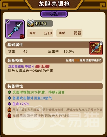 龙胆亮银枪:枪身闪耀着凛冽的寒光,它自带15.0%的反击率,装备技能触发时,会对敌人造成攻击 250%的沉重打击,而其装备特性更是将防御与反击融为一体,反击之时,枪身上会环绕一层10%最大生命的护盾,持续 2回合,为使用者抵御后续的攻击,普通攻击同样能额外回复 10怒气,生命加成25%,使得使用者在战场上更加持久耐用,尤为独特的是所有护盾皆会转化为龙魂盾,这龙魂盾仿若拥有灵性,在受到普通攻击时,能反弹攻击力25%的反击伤害,而当龙魂盾存在时,反弹伤害更是能提升至攻击力的75%。