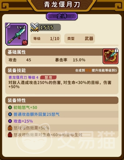 青龙偃月刀:这把大刀自带15.0%的暴击率,对敌人造成攻击 250%的伤害时,若敌人生命值低 30%,伤害更是会额外提升 0%,这一特性使得青龙偃月刀在面对残血敌人时,效果很不错,其初始怒气便高达50,再加上普通攻击额外回复25怒气,攻击加成25%,让使用者在战斗初期便能迅速进入状态,爆发出惊人的战斗力,怒攻增伤效果提升50%,且对生命值低于60%的目标生效,这一特性使得青龙偃月刀在战斗中能够抓住每一个战机。