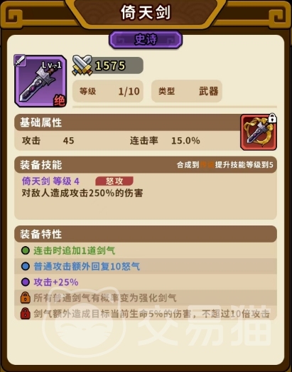 倚天剑:当怒攻之时,那凌厉的剑气可以对敌人造成高达攻击 250%的毁灭性伤害,同时连击率瞬间提升 15.0%,在连击之际,会追加一道凛冽剑气,普通攻击时还能额外回复10怒气,为战斗续航注入了源源不断的动力,攻击加成 25%,令伤害数值直线攀升,而所有普通剑气更有一定概率幻化为强化剑气,此强化剑气除原本伤害外,还能额外造成目标当前生命5%的伤害,且不超过10倍攻击,这一特性使得倚天剑在面对强敌时,能够直击要害。
